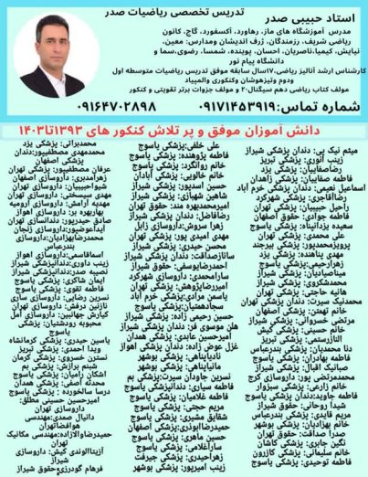 مدرس آموزشگاه های ماز ، رهاورد ، آکسفورد ، گاج ، کانون ریاضی شریف ، رزمندگان ، ژرف اندیشان ، و مدارس : معین ، نیایش ، کیمیا ، ناصریان ، احسان ، پوینده ، شمسا ، رضوی ، سما و دانشگاه پیام نور کارشناس ارشد آنالیز ریاضی ، 17 سال سابقه تدریس موفق ریاضیات متوسطه اول و دوم و تیبزهوشان و کنکوری و المپیاد